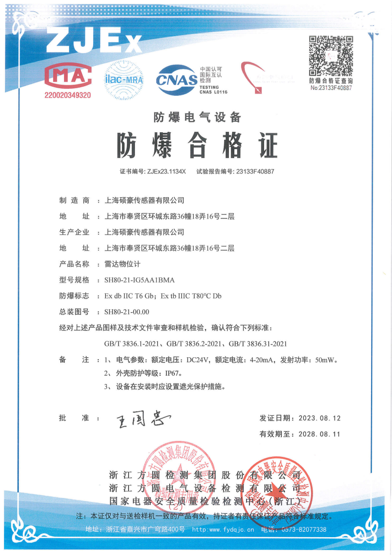 雷达物位计防爆合格证