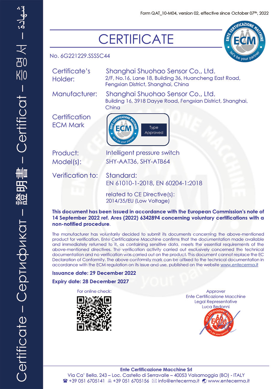 智能压力开关CE证书